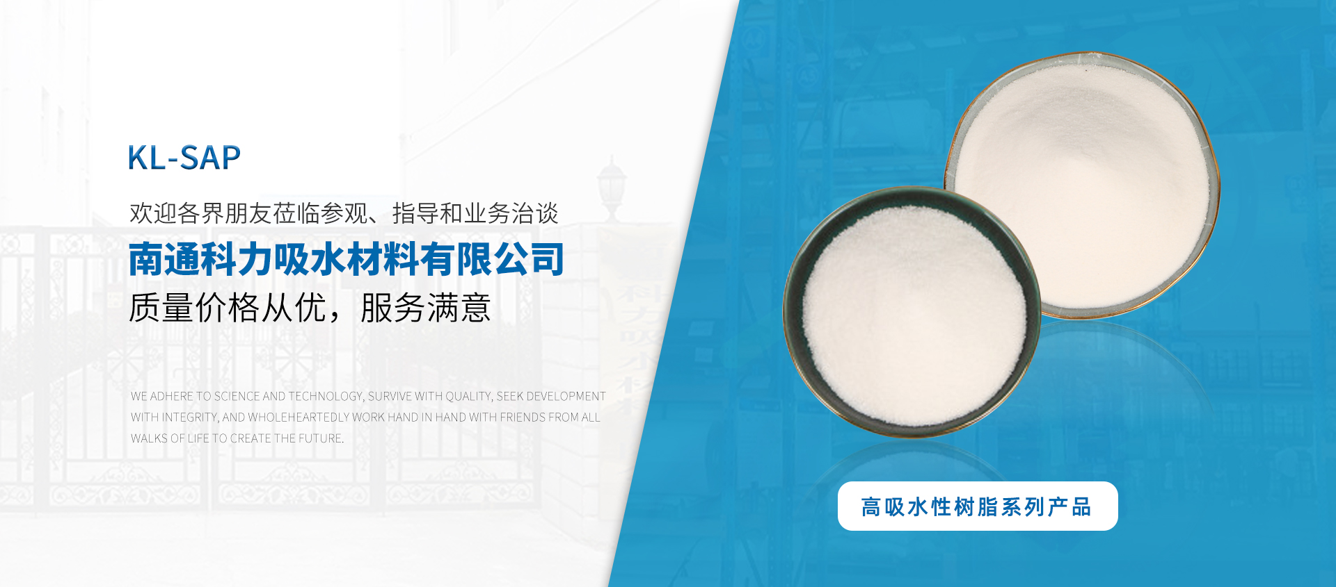 南通科力吸水材料有限公司是在原如皋市科力化工廠(chǎng)的基礎(chǔ)發(fā)展而成的,原如皋市科力化工廠(chǎng)成立于1999年,早前自1991年始著手高吸水性樹(shù)脂的實(shí)驗(yàn)室研究工作,是國(guó)內(nèi)早期從事高吸水性樹(shù)脂研制生產(chǎn)和應(yīng)用開(kāi)發(fā)為數(shù)不多的廠(chǎng)家之一。南通科力吸水材料有限公司生產(chǎn)的高吸水樹(shù)脂性能優(yōu)越、各項(xiàng)理化指標(biāo)合格,尤其是針對(duì)我國(guó)南方潮濕地區(qū)使用時(shí),具有良好的抗結(jié)塊性,吸水量大,吸水速度快,保水性高,凝膠強(qiáng)度大等優(yōu)點(diǎn)。企業(yè)檢測(cè)手段齊全,質(zhì)量穩(wěn)定可靠。我公司座落于江蘇歷史名城、中國(guó)花木盆景之都、世界長(zhǎng)壽養(yǎng)生福地的如皋,南瀕長(zhǎng)江,204國(guó)道、新長(zhǎng)鐵路貫穿南北、沿海高速如皋丁堰出口離我廠(chǎng)只有四公里路程,距國(guó)家首批開(kāi)放港口城市——江蘇南通市港口、車(chē)站、機(jī)場(chǎng)只有幾十分鐘車(chē)程,地理環(huán)境優(yōu)越,水、陸、空交通更為便利。...